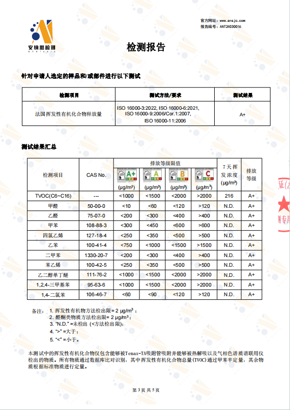 法國A+認(rèn)證是歐洲環(huán)保等級最高的標(biāo)志,也是法國VOC標(biāo)簽環(huán)保等級最高的標(biāo)志。法國VOC標(biāo)簽(即émissions dans l'air intérieur),是室內(nèi)建筑進(jìn)入法國市場強制使用的環(huán)保標(biāo)簽,該標(biāo)簽依據(jù)ISO16000標(biāo)準(zhǔn),對產(chǎn)品28天內(nèi)排放的總揮發(fā)性有機化合物的濃度及另外十種常見的對人體有危害的有機化合物濃度進(jìn)行測試和評級。法國VOC標(biāo)簽共分為A+、A、B、C四個等級,其A+認(rèn)證是法國VOC標(biāo)簽環(huán)保等級最高的認(rèn)證標(biāo)志,該認(rèn)證產(chǎn)品需滿足:TVOC<1000(ug/m3)、甲醛<10(ug/m3)、乙醛<200(ug/m3)。